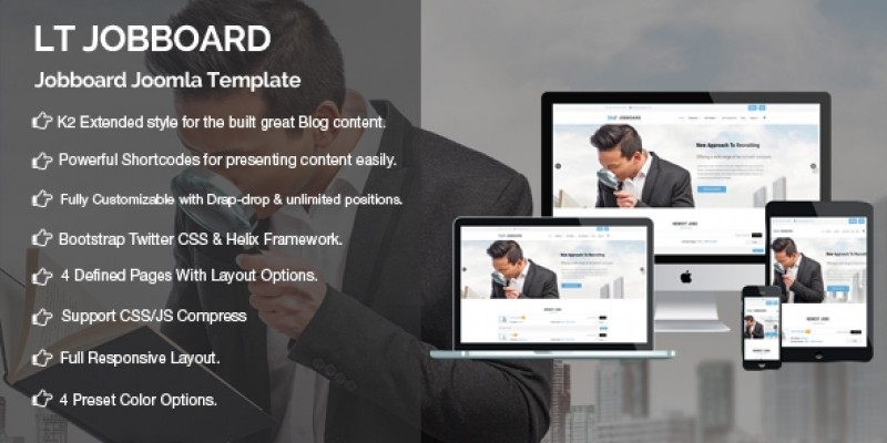 LT Jobboardis responsive targeted at job portal or job board Joomla template website. This is the leading template that facilitates job hunting and range from large scale generalist sites to niche job boards for job categories such as engineering, legal, insurance, social work as well as cross-sector categories such as accounting/finance, customer service and marketing. Users can typically deposit their resumes and submit them to potential employers and recruiters for review, while employers and recruiters can post job ads and search for potential employees. LT Jobboard builds on strong framework with fully bootstrap under 100% responsive layout (support for mobile devices), powerful shortcodes, unlimited position. Besides, JS Jobs allows you to run your own, unique jobs classifieds service where you or employer can advertise their jobs and job seekers can upload their Resumes. Furthermore, it comes with 4 color schemes helping to create excellent websites with various layouts.